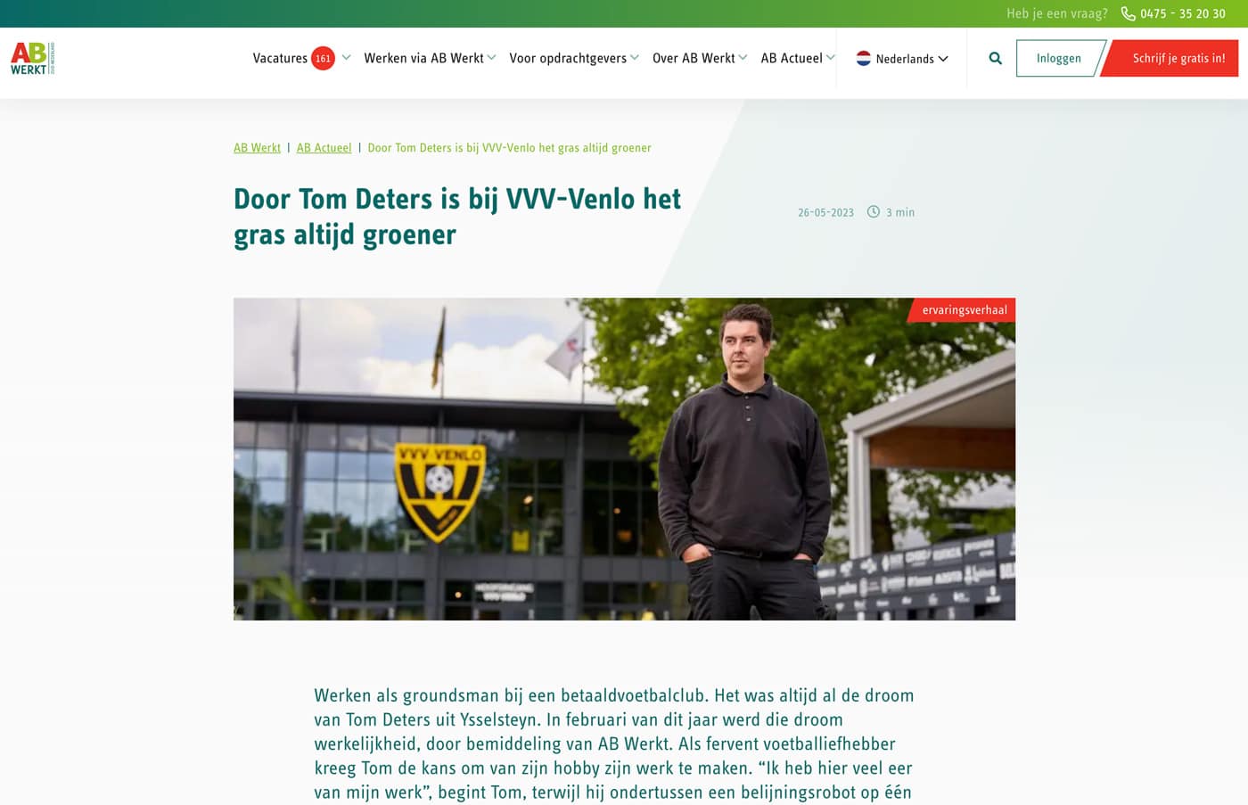 Ervaringsverhalen noemen ze het bij werkspecialist AB Werkt. Verhalen van opdrachtgevers, coöperatieleden en medewerkers waarin zij hun ervaringen met AB Werkt delen. Ik trek regelmatig Limburg en Brabant in om deze verhalen op te halen. Zo sta ik de ene keer op het erf van een fruitbedrijf of paardenfokkerij. Volg ik de andere keer een groundsman tijdens zijn werk bij een betaaldvoetbalclub. Of ga ik in gesprek met een bedrijfsverzorger in de stallen van een veebedrijf. Dit is zo’n verhaal: https://www.ab-werkt.nl/artikel/tomdeters/